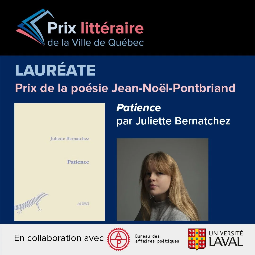 La Ville de Québec, en collaboration avec l’Université Laval et le Bureau des affaires poétiques, a décerné le Prix de la poésie Jean-Noël-Pontbriand à Juliette Bernatchez. Elle remporte une bourse de 5 000 $, une plaque honorifique de l’Université Laval en plus de faire partie de la programmation officielle du SILQ.